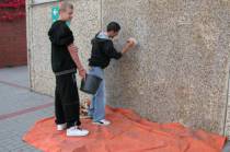 Mit zum Glück nur wenig Verspätung ging es dann doch los: Der Rahmen wurde von den Schülerinnen und Schülern selbst an die Steinwandplatte gedübelt , Zement aufgetragen und die einzelnen Bildteile nacheinander aufgesetzt.
