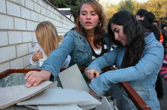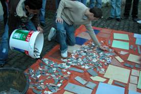 Um an kleinere und passendere Mosaikteile zu kommen, konnten die Schüler draußen Fliesen zerschlagen .